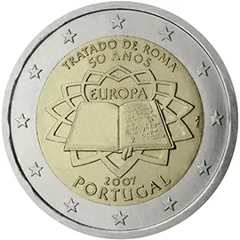 A moeda exibe o documento do Tratado, assinado pelos seis membros fundadores, sobre um fundo que evoca o pavimento (projetado por Michelangelo) da Piazza del Campidoglio em Roma, onde se realizou a cerimónia de assinatura, em 25 de março de 1957. As inscrições “Tratado de Roma”, “50 anos” e “EUROPA”, bem como o nome do país emissor, figuram nas respetivas línguas da área do euro ou em latim. Assim, a imagem exibida é igual, mas as inscrições variam consoante o país. O Tratado de Roma instituiu a Comunidade Económica Europeia e levou à introdução do euro em 1999 e à entrada em circulação das notas e moedas de euro em 2002. As comemorações do 50.º aniversário tiveram lugar em 25 de março de 2007. Os países da área do euro decidiram celebrar o acontecimento emitindo conjuntamente esta moeda comemorativa. O desenho foi selecionado na sequência de um concurso organizado pelas casas da moeda europeias. A coroa circular externa reproduz as 12 estrelas da União Europeia.
