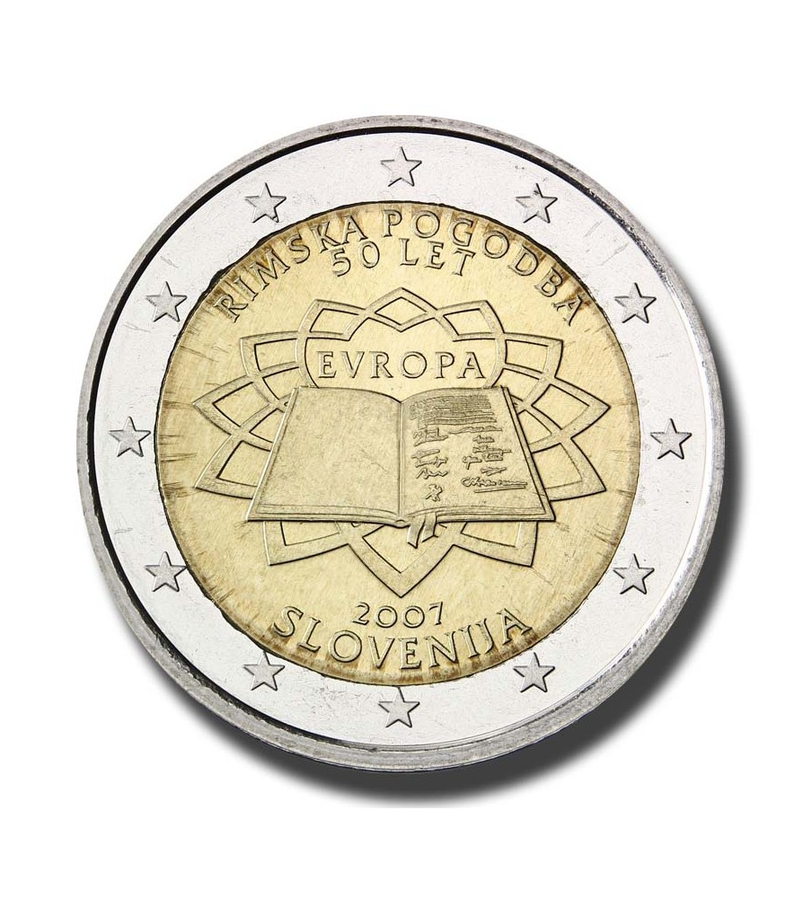 A moeda exibe o documento do Tratado, assinado pelos seis membros fundadores, sobre um fundo que evoca o pavimento (projetado por Michelangelo) da Piazza del Campidoglio em Roma, onde se realizou a cerimónia de assinatura, em 25 de março de 1957. As inscrições “Tratado de Roma”, “50 anos” e “EUROPA”, bem como o nome do país emissor, figuram nas respetivas línguas da área do euro ou em latim. Assim, a imagem exibida é igual, mas as inscrições variam consoante o país. O Tratado de Roma instituiu a Comunidade Económica Europeia e levou à introdução do euro em 1999 e à entrada em circulação das notas e moedas de euro em 2002. As comemorações do 50.º aniversário tiveram lugar em 25 de março de 2007. Os países da área do euro decidiram celebrar o acontecimento emitindo conjuntamente esta moeda comemorativa. O desenho foi selecionado na sequência de um concurso organizado pelas casas da moeda europeias. A coroa circular externa reproduz as 12 estrelas da União Europeia.
