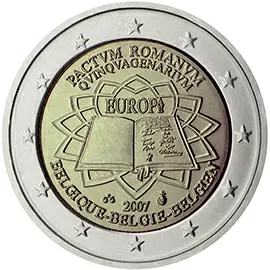 A moeda exibe o documento do Tratado, assinado pelos seis membros fundadores, sobre um fundo que evoca o pavimento (projetado por Michelangelo) da Piazza del Campidoglio em Roma, onde se realizou a cerimónia de assinatura, em 25 de março de 1957. As inscrições “Tratado de Roma”, “50 anos” e “EUROPA”, bem como o nome do país emissor, figuram nas respetivas línguas da área do euro ou em latim. Assim, a imagem exibida é igual, mas as inscrições variam consoante o país. O Tratado de Roma instituiu a Comunidade Económica Europeia e levou à introdução do euro em 1999 e à entrada em circulação das notas e moedas de euro em 2002. As comemorações do 50.º aniversário tiveram lugar em 25 de março de 2007. Os países da área do euro decidiram celebrar o acontecimento emitindo conjuntamente esta moeda comemorativa. O desenho foi selecionado na sequência de um concurso organizado pelas casas da moeda europeias. A coroa circular externa reproduz as 12 estrelas da União Europeia.