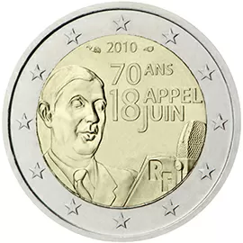 A moeda comemora o 70.º aniversário do apelo lançado de Londres, em 18 de junho de 1940, através da BBC, pelo General Charles de Gaulle – líder das Forças Francesas Livres – após a derrota da França, o qual ficou conhecido como “Apelo de 18 de Junho”. Dirigindo‑se ao povo francês, o General de Gaulle proclamou que a guerra ainda não tinha terminado. Considera‑se que este discurso marca o início da resistência francesa e da luta contra a ocupação da França durante a Segunda Guerra Mundial. A coroa circular externa exibe as 12 estrelas da União Europeia.