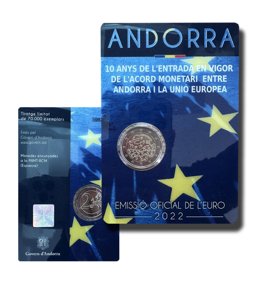 ANDORRA 2 euro 2022 10 anos Convenção Monetária entre Andorra e a União Europeia 20,00 € Desconto de %. Partilhar Comprar Contactar 10 anos desde a entrada em vigor da Convenção Monetária entre Andorra e a União Europeia