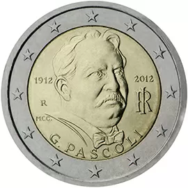 O núcleo da moeda exibe a efígie de Giovanni Pascoli, poeta da região de Romagna e figura de vulto da literatura italiana de finais do século XIX. À esquerda da efígie, encontram‑se gravados o ano da morte do poeta (1912), a insígnia da casa da moeda (R) e as iniciais da desenhadora Maria Carmela Colaneri (M.C.C.). À direita, imediatamente acima do monograma da República Italiana (RI), vê‑se o ano de emissão (2012). Abaixo da efígie, a inscrição “G. PASCOLI” forma um semicírculo ao longo do bordo inferior do núcleo da moeda. A coroa circular externa apresenta as 12 estrelas da União Europeia.