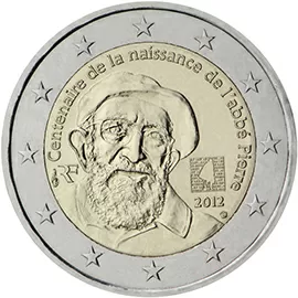 No núcleo da moeda, ligeiramente à esquerda, figura a efígie do Abade Pierre com a sua boina característica e, à direita, o logótipo da fundação com o seu nome, incluindo, em carateres minúsculos, a pergunta “Et les autres?” (E os outros?), o seu lema favorito para evocar que nunca nos devemos esquecer de ajudar os outros. Ao longo do bordo superior do núcleo da moeda, a inscrição “Centenaire de la naissance de l’abbé Pierre” forma um semicírculo em torno da efígie. À esquerda da inscrição, vê‑se a insígnia da casa da moeda (a cornucópia) e as letras indicativas do país emissor (RF) e, à direita, o símbolo da oficina de gravação (a “fleurette”). A coroa circular externa reproduz as 12 estrelas da União Europeia.
