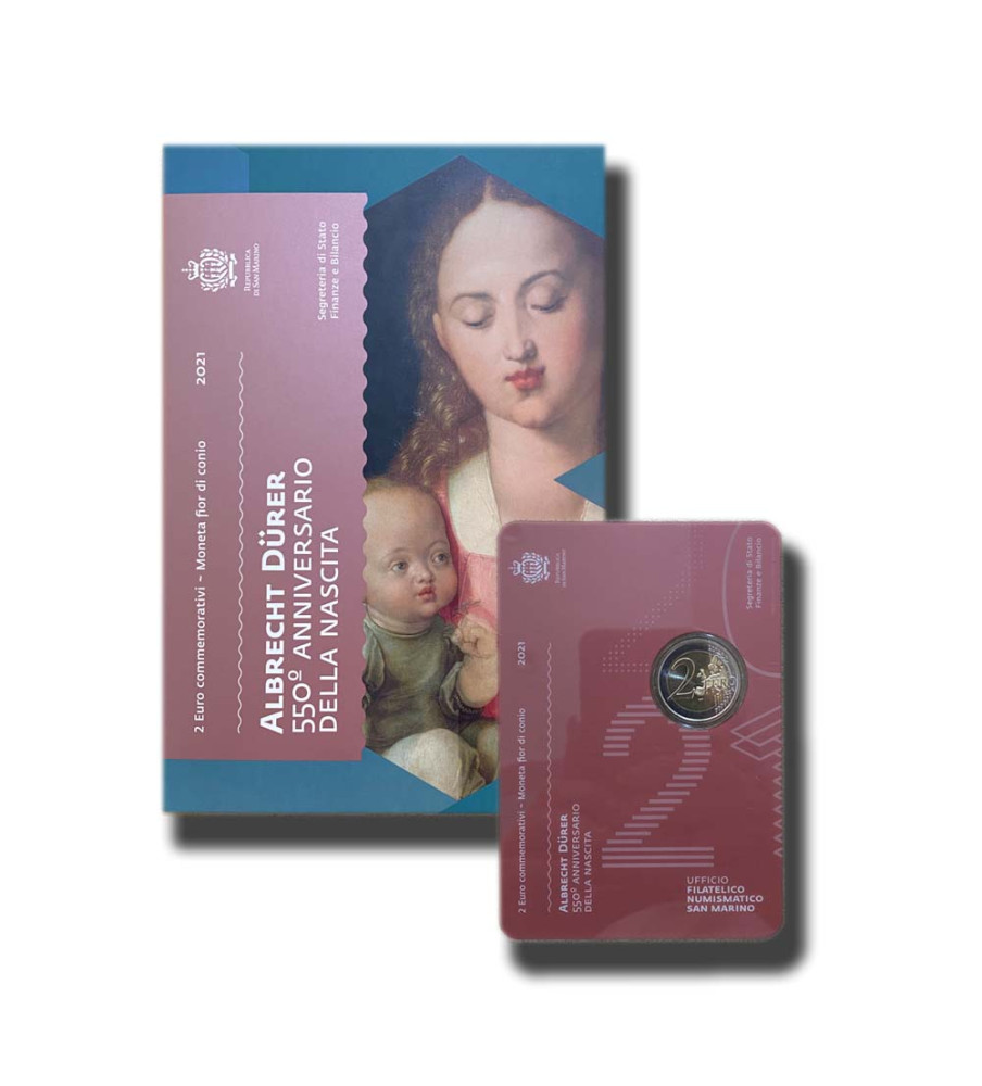 Sao Marino 2 euro Albrecht Dürer 2021 35,00 € Desconto de %. Partilhar Comprar Contactar Cartão comemorativo de 2 euros do 550º aniversário do nascimento de Albrecht Dürer, San Marino, 2021.