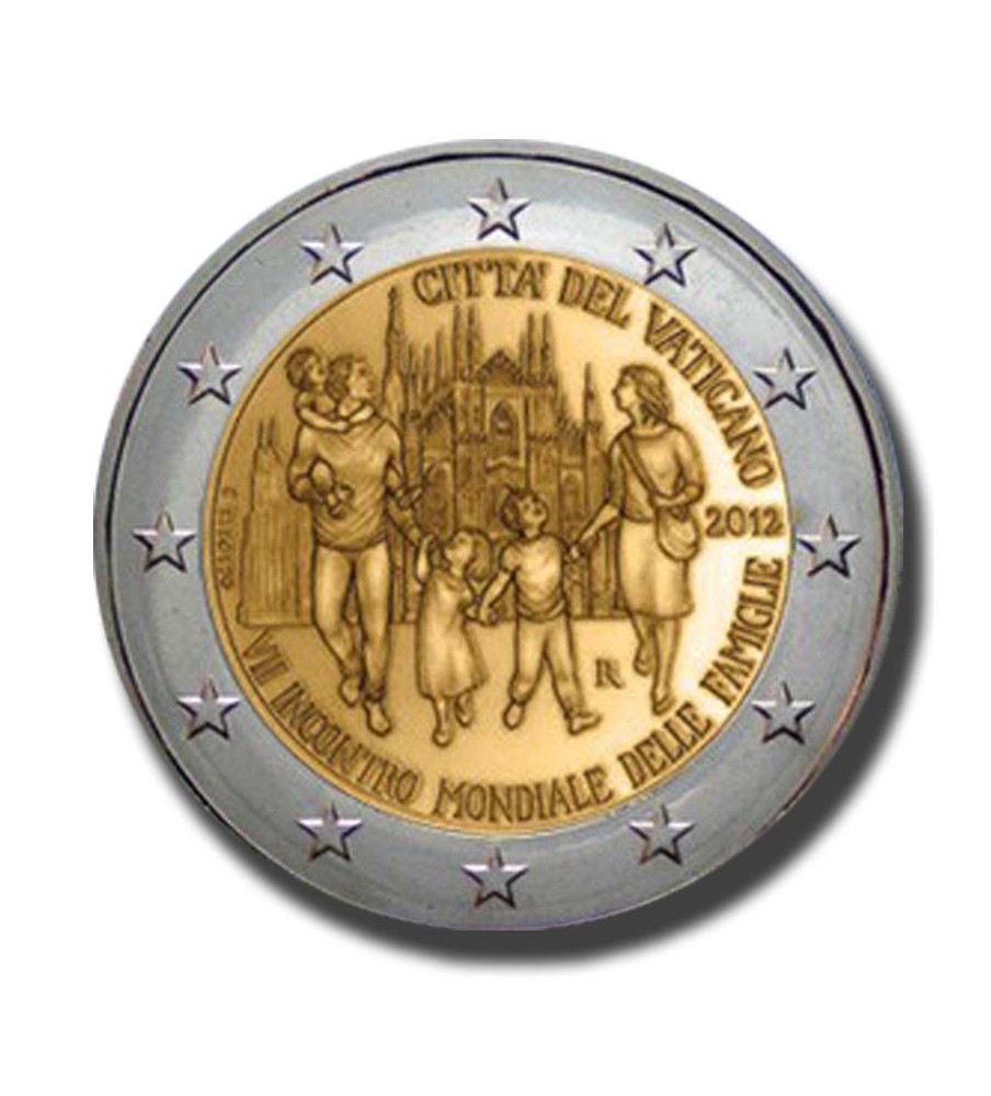 O núcleo da moeda apresenta uma família, tendo como pano de fundo a catedral da cidade de Milão, anfitriã do VII Encontro Mundial das Famílias. Este evento realiza‑se de três em três anos e visa destacar a família como património comum da humanidade, o seu caráter universal e o seu contributo para uma existência plenamente humana em todo o mundo. Em redor da imagem da família, figuram, em italiano, os nomes do evento e do Estado emissor (CITTÀ DEL VATICANO), bem como o ano de emissão (2012). O monograma da casa da moeda (R) surge entre as figuras do menino e da mãe. A coroa circular externa reproduz as 12 estrelas da União Europeia.